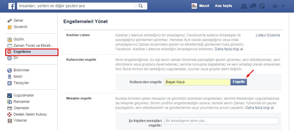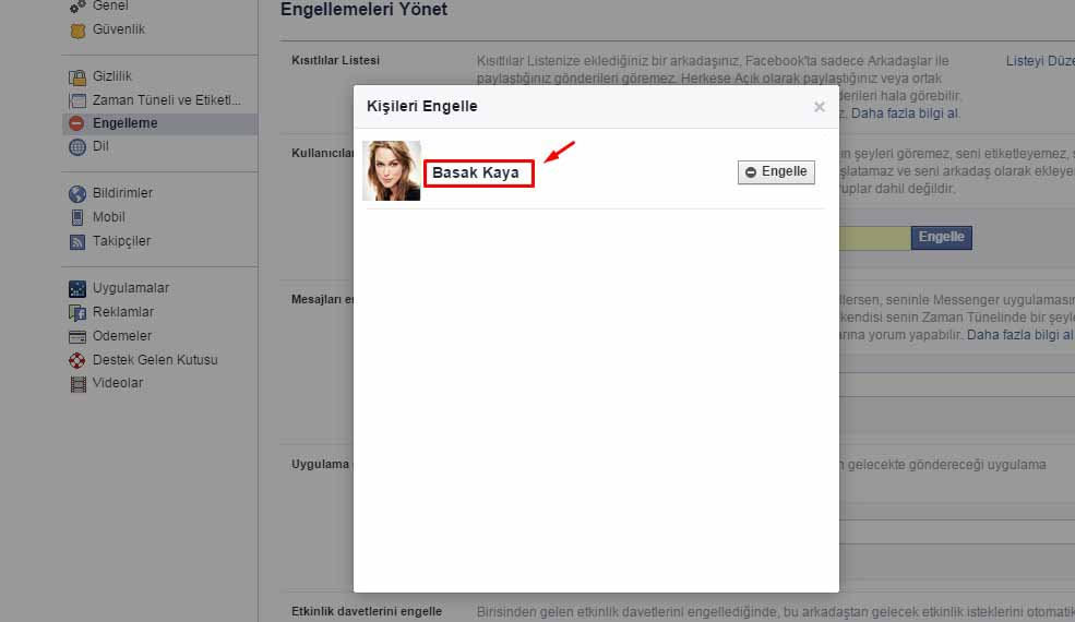 2- Açılan pencerede Engelleme seçeneğini seçin. Açılan kısımda kimin sizi engellediğini bulmak için ismini girin. Ve engelle deyin!