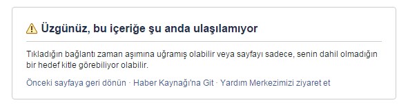 Tanıdığınız birinin facebookundan kişinin adını arattırın! Eğer arattığınız kişi arkadaşınızın facebook‘unda çıkıyorsa URL’sini kopyalayın ( Örneğin: https://www.facebook.com/372277jashd ) ve kendi facenizde iken tarayıcıya yapıştırıp enter deyin. Eğer sizde görünmüyorsa ve aşağıdaki fotoğraftaki gibi “Üzgünüz, bu içeriğe şu anda ulaşılamıyor” uyarı geliyorsa %100 engellendiniz! Eğer profili görünüyor ve Arkadaş Ekle yazısı çıkıyorsa sizi silmiştir.