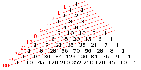 Ömer Hayyam veya Pascal veya Binom Üçgeni: Ömer Hayyam üçgenindeki tüm katsayılar veya terimler yazılıp çapraz toplamları alındığında Fibonacci Dizisi ortaya çıkar.