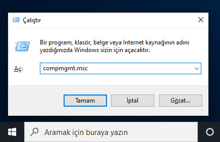 Klavyeden Windows ve R tuşuna basıyoruz. Gelen çalıştır paneline “compmgmt.msc” yazıp “Enter” yapıyoruz.