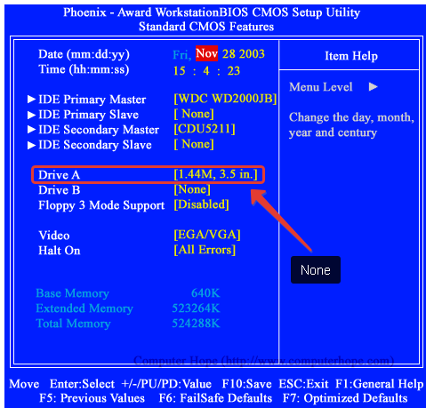 Bilgisayarın açılışında BIOS ekranına giderek Disket Sürücünü iptal edebilirsiniz. Bunun için alttaki resimdeki gibi örneğin; BIOS eski sürüm olan Award BIOS ise, Drive A‘nın sağındaki seçeneği “None“ yapmanız yeterlidir.