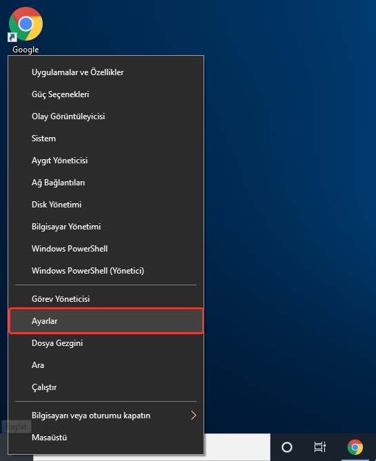 – Başlat/Windows simgesini sağ tıklayıp “Ayarlara” gidiyoruz.