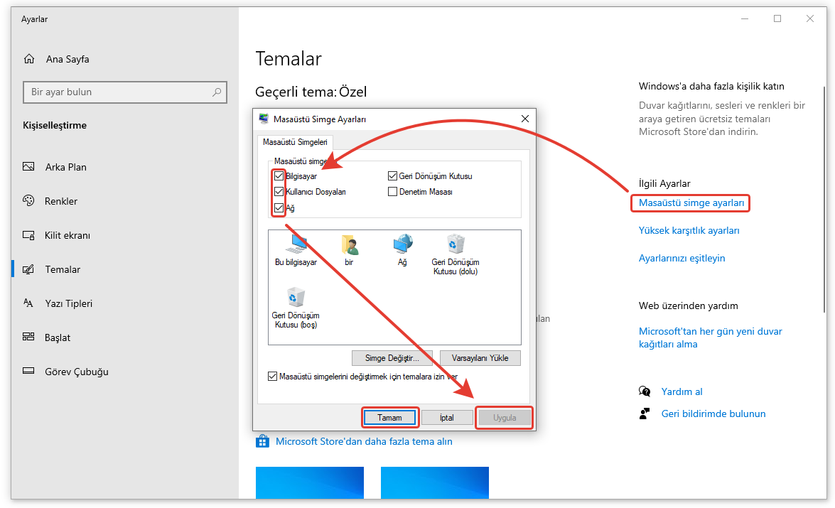 – Gelen sayfada “Masaüstü Simge Ayarları” yazan sekmeyi tıklıyoruz. Ardından Bilgisayar, Kullanıcı Dosyaları, Ağ gibi masaüstü simgelerinin solundaki kutucukları işaretleyip “Uygula” ve “Tamam” diyoruz. Böylece masaüstüne simgeler gelmiş oluyor.