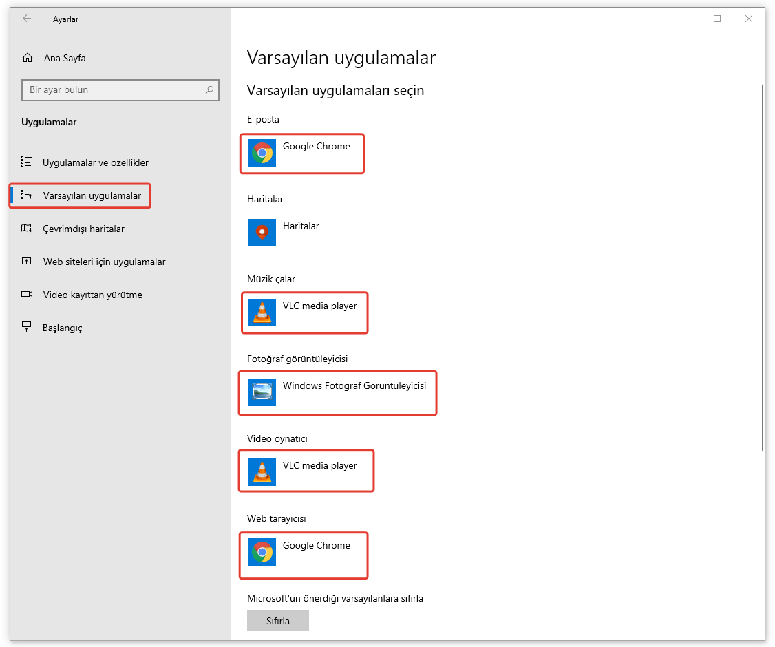 – Gelen pencereden “Varsayılan Uygulamalar” sekmesini tıkladıktan sonra aşağıdaki gibi değişikleri yapıyoruz. Örneğin; E-posta‘nın altındaki Microsoft Edge‘yi tıkladığımızda Google Chrome‘u seçiyoruz ve “Yinede Değiştir” diyoruz. Bu işlemleri tüm yüklediğimiz uygulamalar için yapıyoruz.
