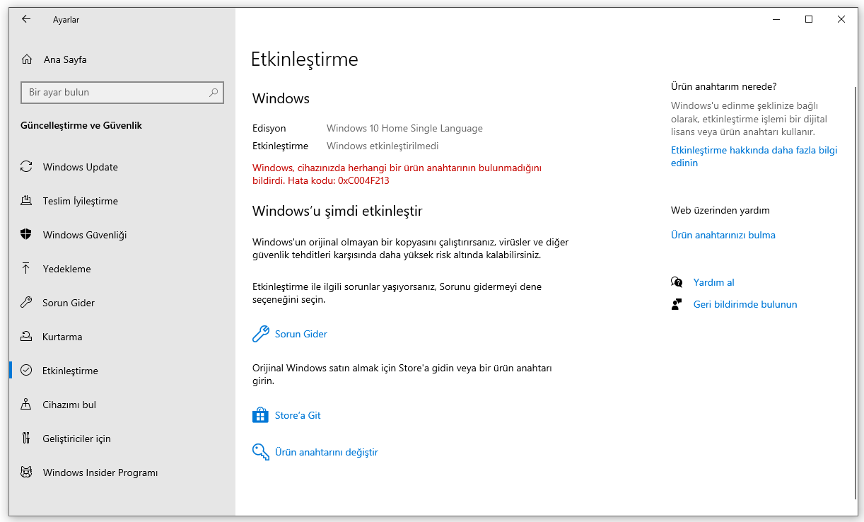 Fakat aşağıdaki gibi “Windows etkinleştirilmedi” uyarısı varsa bilgisayarınızı etkinleştirmeniz gerecek. Burada karşımıza iki seçenek çıkıyor. Ya 25-50 TL verip orijinal lisans anahtarı (ürün anahtarı) ile kullanmak ki ben bunu tavsiye ediyorum. Veya bütçeniz yoksa aşağıdaki linkte verdiğim bağlantıdaki programı kullanarak Windows 10’u etkinleştirmek. İşlem tamamen size kalmış.
