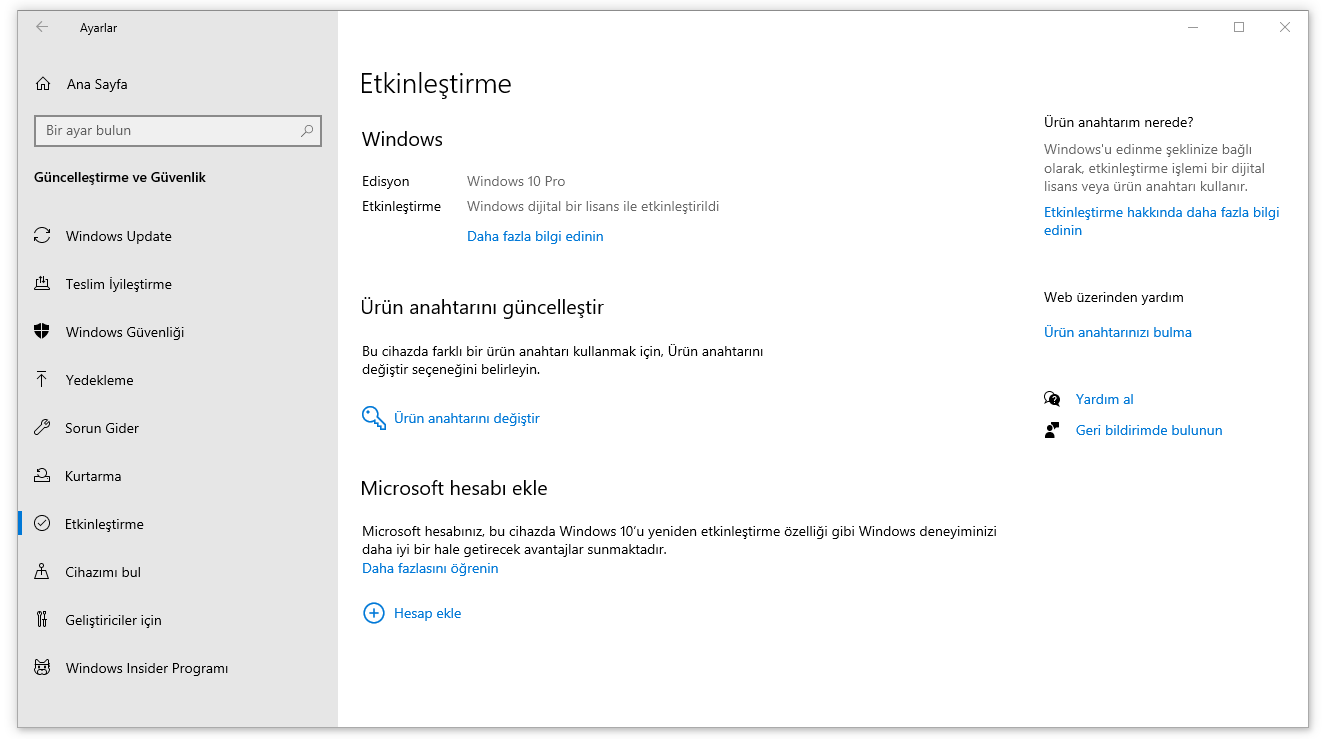Şimdi ilk olarak “Windows 10” etkinleştirme işleminden bahsedeyim. İlk olarak ” Başlat/Windows” simgesini sağ tıklayıp “Ayarlar” ardından ve “Güncelleştirme ve Güvenlik” sekmesine gidiyoruz. Burada sol taraftaki “Etkinleştirme” kısmına tıklıyoruz. Eğer karşımıza aşağıdaki gibi “Windows dijital bir lisans ile etkinleştirildi” uyarısı varsa sizi tebrik ediyorum. Bilgisayarınız Windows‘u orjinal haliyle kullanıyor. Artık sınırsız, süresiz bir şekilde kullanmaya devam edebilirsiniz.