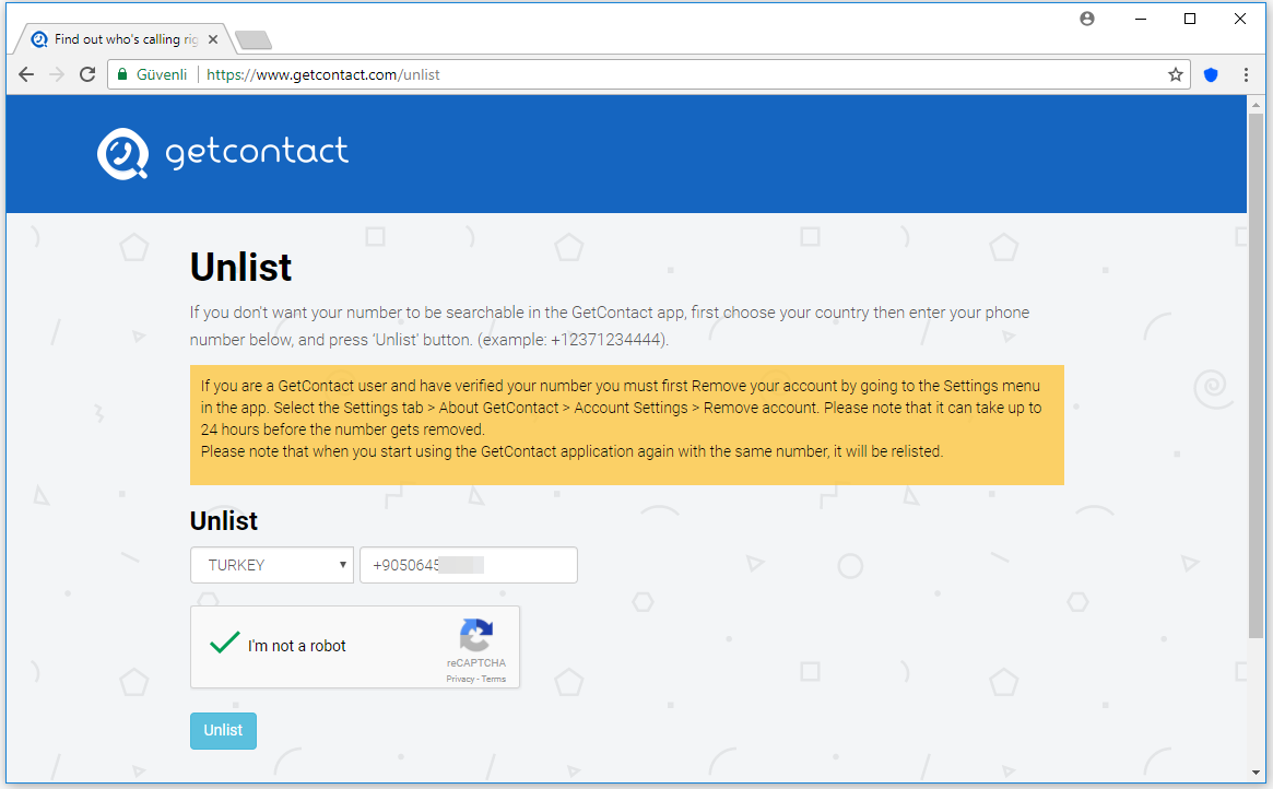 5- Üstteki gibi mavi logo çıktıktan sonra https://www.getcontact.com/en/unlist adresine gidin ve telefon numaranızı (isminizi) silin. Numaranız 24 saat içinde silinecektir. Ancak bundan önce uygulamayı telefonunuzdan kaldırmayı unutmayın.
