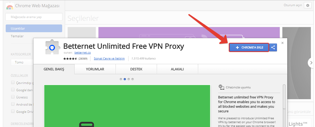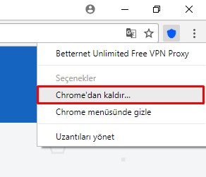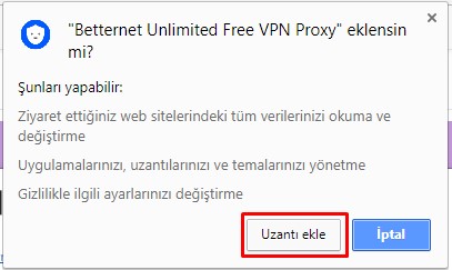 3- Chrome’a Ekle dedikten sonra açılan küçük panelde Uzantı Ekle diyelim ve sayfamızın sağ üst köşesinde Betternet VPN‘in pasif halde ikonu gelecektir.