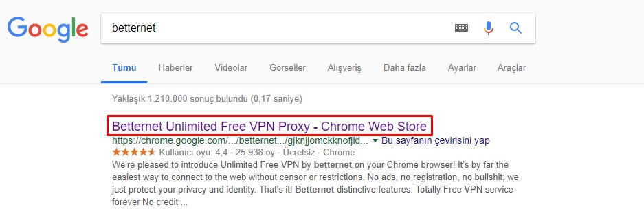 1- GetContact’dan isminizi sildirebilmeniz için öncelikle VPN kullanmanız gerekiyor. Bunun için basitçe Google’ye “betternet” yazın ve açılan ilk sayfadaki (Google Mağaza) linkini klikleyin.
