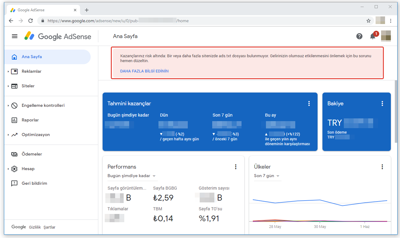 Herkese Merhaba. Yakın zamanda “Google Adsense” hesabını açanlar aşağıdaki gibi; “Kazançlarınız risk altında: Bir veya daha fazla sitenizde ads.txt dosyası bulunmuyor. Gelirinizin olumsuz etkilenmesini önlemek için bu sorunu hemen düzeltin.” uyarısı ile karşılaşıyorlar. Bu yazımızda “bu uyarı neden çıkıyor ve çözümü nedir?” sorularına kısaca yanıt vermeye çalışacağız.