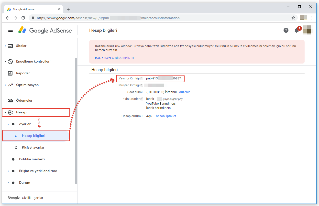 Yayıncı kimliğiniz, AdSense hesabınızın benzersiz tanımlayıcısıdır. Hesabınızın güvenliğini sağlamak ve hesaba özgü bilgileri bulmamızı kolaylaştırmak amacıyla, Google’la iletişime geçtiğinizde bu kimliği belirtmeniz istenebilir. Yayıncı kimliğiniz şöyle görünüyor: pub-1234567891234567.