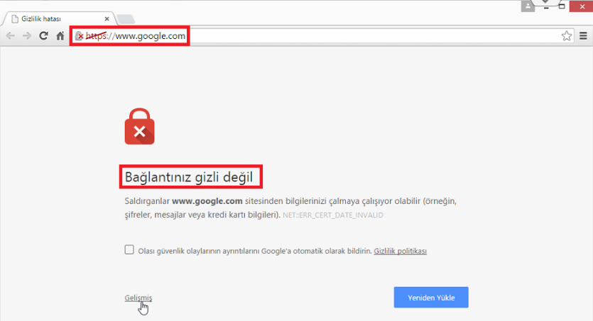 İkincil temel nedeni web sitesinin SSL dediğimiz sertifika hatasından kaynaklıdır. Genellikle kurumsal web siteleri (twitter, facebook, resmi siteler, okullar v.s) yada SSL sertifikasına sahip web siteleri kullanıcılarının girdiği şifre/parola v.s güvenli bir şekilde kriptolayarak başkasının eline geçmesinin önüne geçerler. Bazen web sitelerinin sertifikaları geçmişte kalır yada ekstra bir sorun olur bu hatayı verir. Bunda yapacağınız bir şey :)) Eğer illa bu siteye erişmeniz gerekiyorsa hatanın çıktığı gelişmiş bilgileri göster seçeneğini seçerek en altta çıkan linki tıklamak sizi sayfaya yönlendirir. Ama çözüm istiyorsanız devam edelim!…