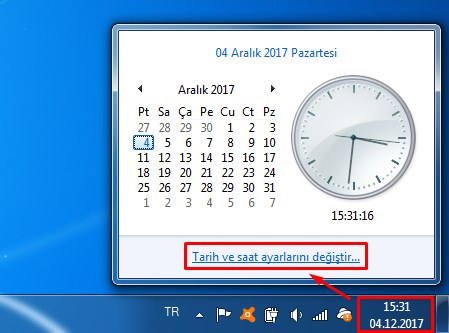 1- Bilgisayarınızın sağ alttaki Tarih/Saat kısmını klikleyiniz. Bir pencere açılacaktır. Açılan pencerede Tarih ve Saat Ayarlarını Değiştirini seçiniz.