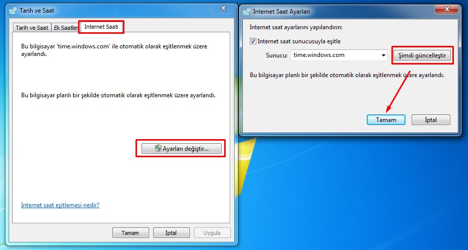 3- Ardından İnternet Saati sekmesine gelerek Ayarları Değiştir diyelim. Son olarak Şimdi Güncelleştir seçeneğini seçin ve Tarayıcınızı (İnternet Sayfanızı) tamamen kapatıp tekrar açın…