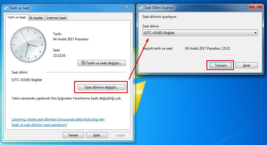 2- Açılan pencerede önce Saat Dilimini Değiştir diyoruz. Ardından saat dilimi UTC+03:00 olan bir seçenekten birini seçiyoruz ve TAMAM diyoruz. (Saat dilimimiz değiştiğinden halen bir çok bilgisayarda güncel olmadığından UTC:03:00’ı seçiyoruz.