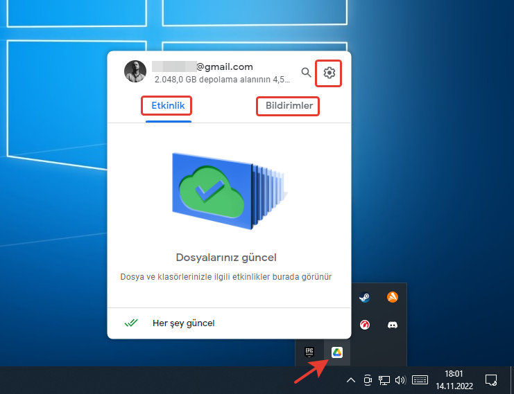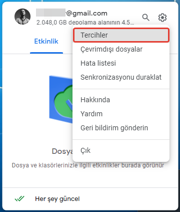 Ayrıca buradaki pencerede anlık olarak yaptığınız işlemler ve bildirimler görünecektir. Örneğin bir belgeyi sildiniz veya Drive’ım klasörüne attığınızda senkronizasyon işleminin ne durumda olduğunu buradan takip edebilirsiniz.