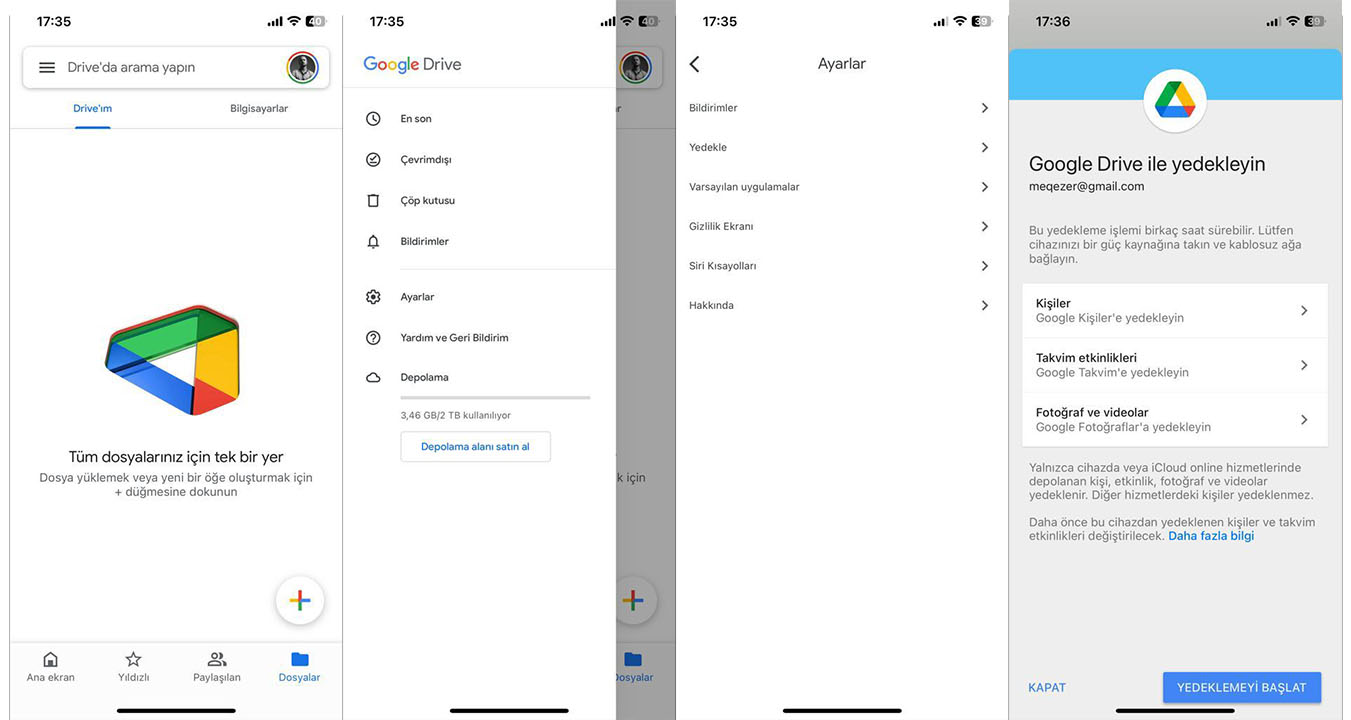 Google Drive’da yapılacak ayar ise uygulamayı açtıktan sonra sol üst kısımdan yatay üç çizgi simgesine dokunduktan sonra AYARLAR – YEDEKLE kısmına giderek Kişiler, Takvim Etkinlikleri ve Fotoğraf ve Videolar seçeneklerini açık hale getirmek. Bunları yaptıktan sonra “YEDEKLEMEYİ BAŞLAT” dediğinizde artık burada işimiz tamamlanmış oluyor.