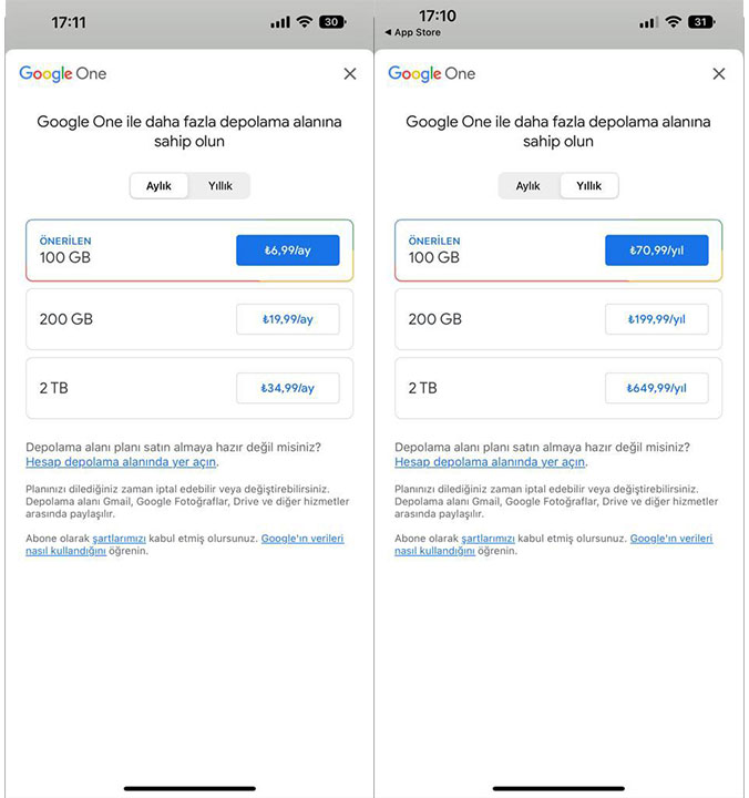 Hemen altta aylık ve yıllık olarak 100 GB, 200 GB, 2 TB şeklinde ödeme ücretlerini görebiliyorsunuz.