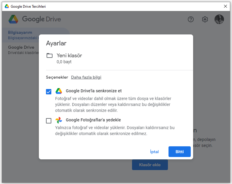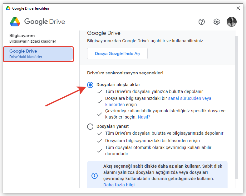 Google Drive sekmesinde ise karşımıza Drive’ım senkronizasyon seçenekleri başlığı altında Dosyaları akışla aktar ve Dosyaları yansıt şeklinde iki seçenek gelecektir. Burada varsayılan olarak Dosyaları akışla aktar seçeneği işaretli olacaktır. Böylece Tüm yedekleriniz yalnızca bulutta depolanır. Ancak Dosyaları yansıt seçeneği seçerseniz yedekleriniz, verileriniz hem bilgisayarınızda hem bulutta depolanır. Bu çok fazla alan kaplayacağından tercih edilmez.
