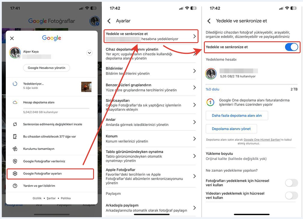 Google Fotoğraflar’da yapılacak ayar ise uygulamayı açtıktan sonra sağ üst kısımdan profil simgenize dokunduktan sonra GOOGLE FOTOĞRAFLAR AYARLARI kısmına giderek Yedekle ve Senkronize et seçeneğini açık hale getirmeniz gerekiyor. Bunları yaptıktan sonra burada işimiz tamamlanmış oluyor. Ayrıca menüdeki diğer seçenekleri inceleyerek kendinize göre optimize edebilirsiniz.