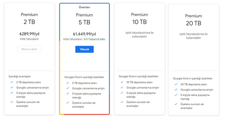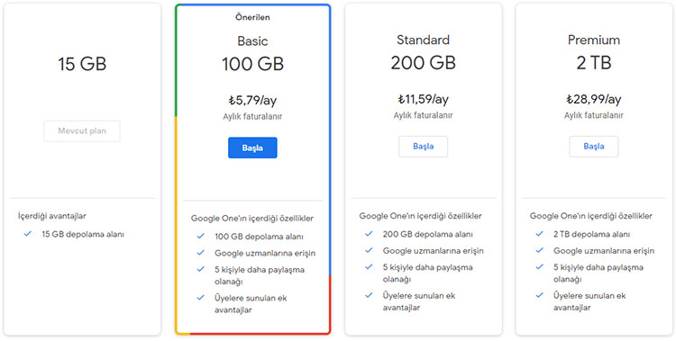NOT: Eğer yukarıdaki fiyatlardan daha yüksek seçenekler varssa Google Drive hesabınıza biraz veri atarak tekrar deneyin. Boş Google Drive hesaplarına uygun planlar sunulmuyor.