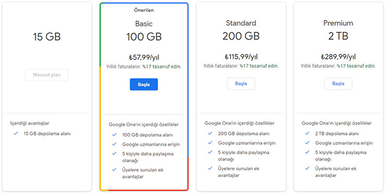 Satın alma işlemlerini telefonunuzun Google One uygulaması üzerinden yapabileceğiniz gibi bilgisayarınızdan Google One hizmetine (tıkla) giderek yapabilirsiniz. Unutmayın; Google Drive uygulaması üzerinden satın alma işlemlerinde fiyatlar yüksek çıktığını hatırlatalım. Neden böyle bir şey var tam olarak anlamış değilim.