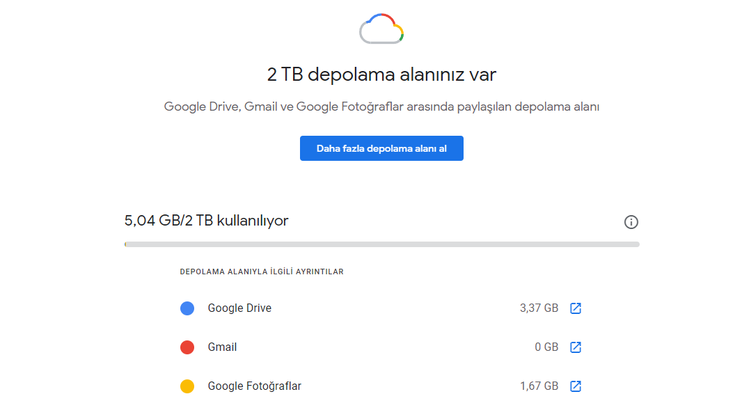 Google başlangıçta 15 GB’lık depolama alanını ücretsiz olarak tüm kullanıcılarına sağlar. Bu alanı Google Drive, Gmail ve Google Fotoğraflar kısmında kullanabilirsiniz. Google Drive‘da daha yüksek kapasiteli depolama alanı satın alabilir veya daha faydalı avantajlardan yararlanmak için Google One‘a yükseltebilirsiniz.