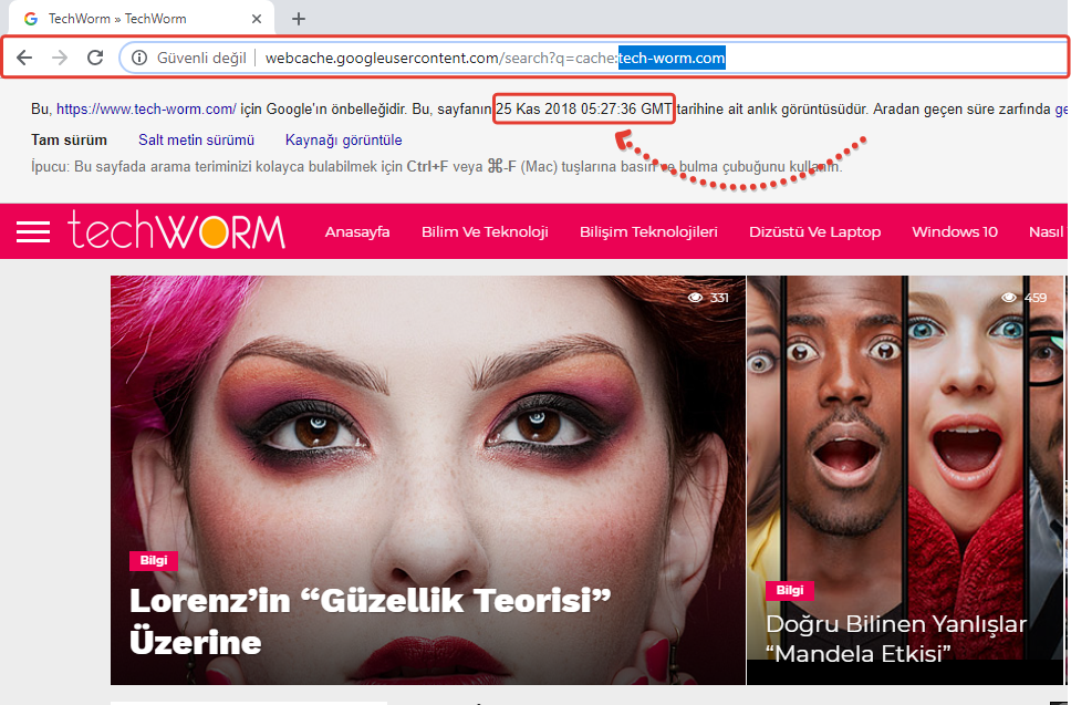Sitenizin en son ne zaman Google tarafından ziyaret edildiğini öğrenmek için aşağıdaki linkin sonunda yer alan kısmı kendi site adınızla değiştirin ve Google Chrome tarayıcısına yapıştırın.