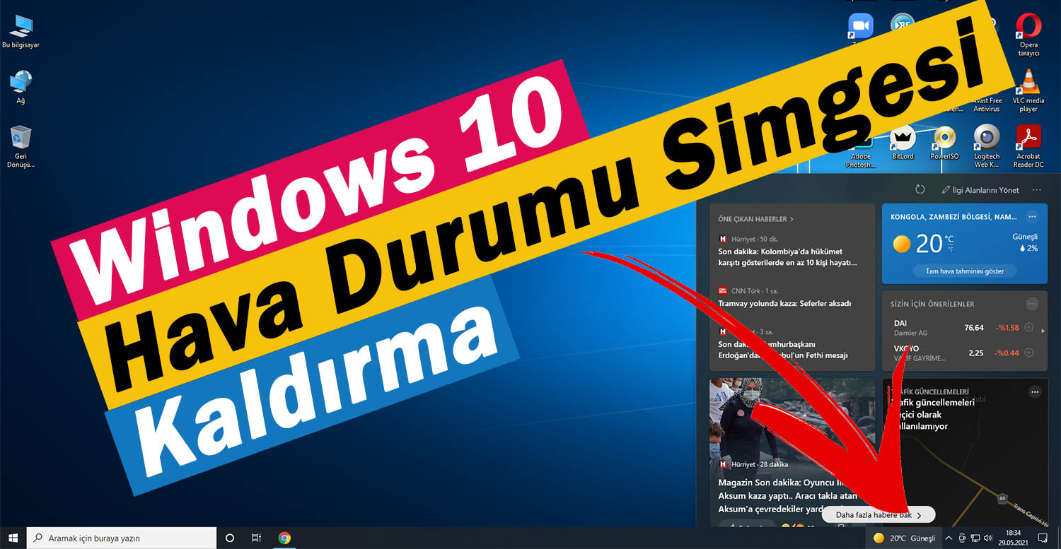 Merhaba Arkadaşlar. Bu yazımızda sizlere Windows 10’da “Görev Çubuğundaki Hava Durumu Simgesini Kaldırma” konusunda bilgi vermeye çalışacağız. Biliyorsunuz Windows 10’un son güncellemesi ile birlikte görev çubuğu üzerinde hava durumu simgesi ile birlikte haberler ve ilgi alanları diye bir panel geldi. Tabi birçok kişinin bu özelliği pek beğenmediğini söyleyebiliriz. İsterseniz bunu hızlı bir şekilde kaldırabilirsiniz. Şimdi size anlatacağım iki farklı yöntemle bu “hava durumu, haberler ve ilgi alanları” özelliğini bilgisayarınızdan kapatabilirsiniz. Hazırsanız başlayalım.