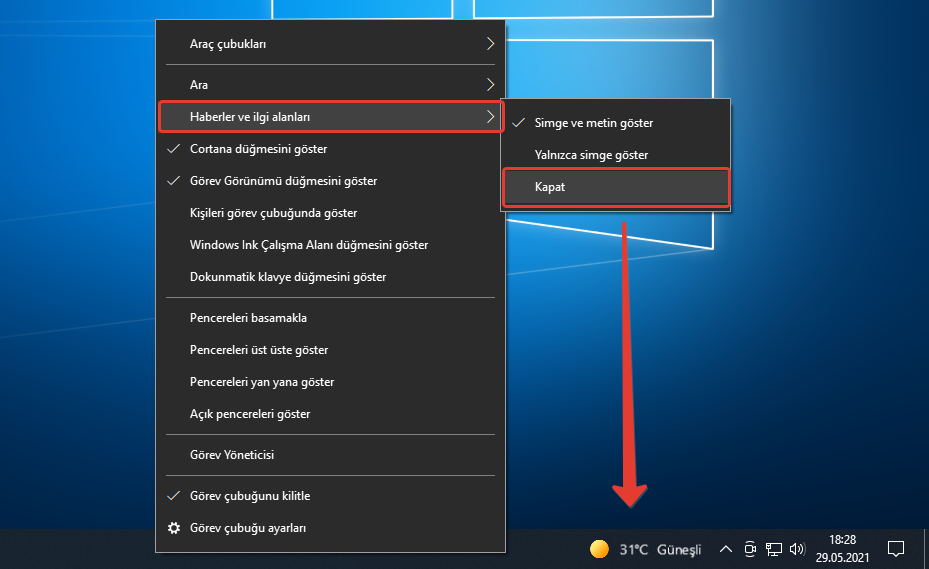 1. Yöntem: Öncelikle doğrudan format ile Windows 10’nun son sürümüne geçiş yaptıysanız. Görev çubuğu üzerindeki ayarlardan bunu kapatabilirsiniz. Bunun için görev çubuğu üzerinde sağ tıklayın. Buradan “Haberler ve İlgi Alanları” sekmesine, ardından “Kapat” seçeneğini seçtiğinizde “Hava Durumu Simgesini” bilgisayarınızın görev çubuğu üzerinden kaldırabiliyorsunuz.
