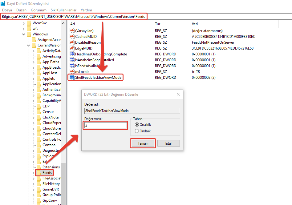 Bunun için klavyeden Windows ile R tuşuna basıyoruz. Gelen küçük panele “regedit” yazdıktan sonra “tamam” diyoruz. Karşımıza “kayıt defteri düzenleyicisi” gelecektir. Burada sırasıyla; HKEY_CURRENT_USER | SOFTWARE | Microsoft | Windows | CurrentVersion | Feeds kısmına gidip ShellFeedsTaskbarViewMode seçeneğine çift tıklıyoruz. Gelen pencerede değer verisine “2” yazdığımızda “Hava Durumu Simgesi” bilgisayarınızın görev çubuğu üzerinden kaldırılmış oluyor. Eğer eski haline getirmek isterseniz bu kez “0” yazmayınız gerekiyor.