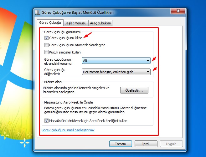 2- Açılan pencereden Görev Çubuğunu kilitleyi seçin. Görev çubuğunun ekrandaki konumunu Alt olarak belirleyin ve Uygula deyin.