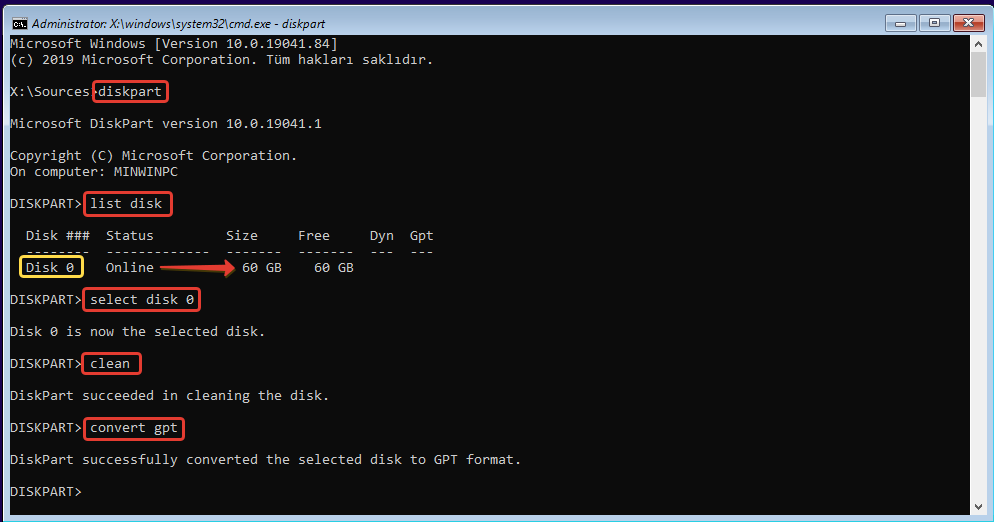 - select disk 0 yazın enter yapın.
