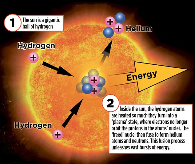 Güneş, %73’ü Hidrojen, %25’i Helyum ve diğer elementlerden (gazlardan) oluşuyor. Güneş, kimyasal reaksiyonlar sonucunda değil, nükleer füzyon reaksiyonlar sonucunda ısı ve ışık açığa çıkarır. Devasa büyüklükte nükleer bir reaktör olan Güneş, içinde bulundurduğu Hidrojen atomlarını, çekirdeğinde oluşturduğu nükleer füzyon reaksiyonları sonucunda Helyum’a dönüştürmeye başlar. Bu süreç sonucunda ortaya helyum, ısı ve ışığın açığa çıkmasına neden olur. Bu görünürde bir parlama olayına neden olur.