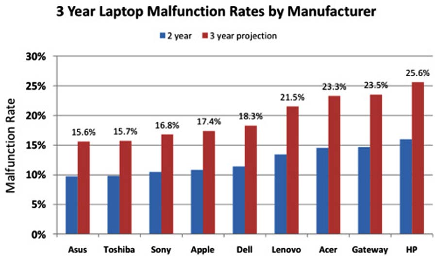 Yapılan araştırma sonucuna göre üç yıl içerisinde Asus çabuk bozulma konusunda en az problem çıkaran laptop özelliğine sahip. Hemen ardından Toshiba, Sony, Apple ve Dell ürünleri bulunuyor. Yine araştırma sonucunda göre HP, Acer ve Gateway üç yıl içerisinde ortalama %24’lük bir bozulma gösteriyor.