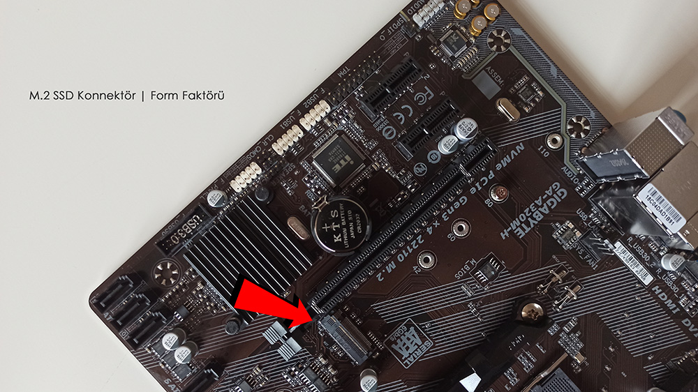 Üçüncü SSD Türümüz ise M.2 SATA AHCI SSD. Genel olarak M.2 SATA SSD kullanılır, AHCI kavramı kullanılmaz. Ancak M.2 SATA SSD’ler temel olarak hepsi AHCI sürücüsüne/protokolüne sahiptirler. Arkadaşlar bu tip SSD’ler masaüstü ve dizüstü bilgisayar anakartının üzerinde bulunan M.2 KonnektörüneM.2 Form Faktörüne veya diğer ismiyle M.2 Yuvasına takarak çalıştırıyorsunuz. Burada M.2 kavramı anakarta üzerindeki yuvayı belirtiyor. SATA kavramı ise SSD’nin anakart üzerinde kullandığı veriyolunu gösterir.  Yukarıda bahsetmiştik, günümüzdeki anakartların neredeyse çoğu SATA 3 veriyolunu destekliyor. Bunun anlamı SATA 3 veriyolunu destekleyen anakartın saniyede 600 MB okuma yazma hızına ulaşacağı yani bu değerde veri transferi yapabileceği anlamına geliyor. Eğer M.2 yuvasına M.2 SATA SSD takarsanız saniyede 600 MB okuma yazma hızına ulaşabilirsiniz. Anakartımın M.2 SATA SSD desteklediğini nasıl anlayabilirim? Bunu anlamanın sadece iki yolu bulunuyor. Birincisi anakartınızın resmî web sitesinden teknik özelliklerine bakarak M.2 SATA SSD destekleyip desteklemediğini öğrenebilirsiniz. İkincisi anakartınızın üzerinde bir M.2 yuvası varsa anakartınız M.2 tipte SSD destekliyor anlamına gelir. Ancak bazı anakartların üzerinde hangi tip veriyolu destekleyen M.2 SSD bilgisi yazılı değildir.  Yani elinizde M.2 SATA SSD varsa anakartınız %100 bunu desteklediği anlamı çıkmaz. Çünkü bazı anakartlar sadece M.2 PCIe SSD dediğimiz PCIe (PCI Ekspress) veriyolu desteklerken bazıları sadece M.2 SATA SSD dediğimiz SATA veriyolunu destekler. Aynı zamanda her iki veriyolunu destekleyen anakartlarda bulunmaktadır. Şu anda gördüğünüz anakart hem M.2 SATA SSD hemde M.2 PCIe NVMe SSD desteklediğini belirtelim.