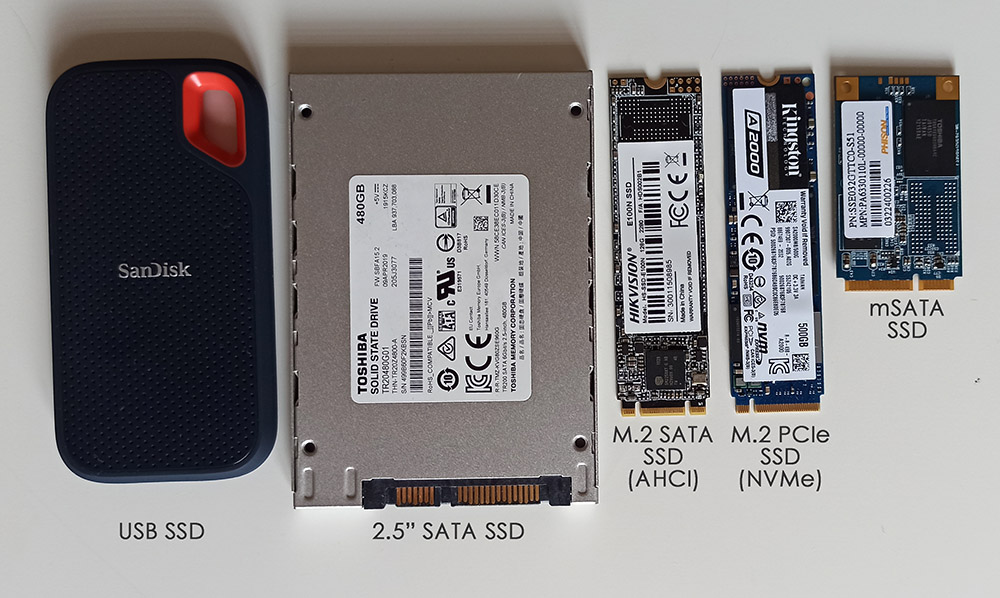 Bunlar sırasıyla USB SSD (yani Taşınabilir/Portable SSD), 2.5” SATA SSD, M.2 SATA SSD, M.2 PCIe NVMe SSD, mSATA SSD şeklinde. Bunlar görünüm olarak oldukça küçük ve hafif olduklarını söyleyebiliriz. Bilgisayarlarda kullandığımız RAM Bellek gibi bir görünümleri bulunuyor. Tabi bazı tipleri kullanım amacına göre kutu içerisinde tasarlanmış. Ancak iç yapıları birbirlerine benzer yapıdadırlar. Fakat farklı teknolojide olabilirler. Burada teknolojiden kastım performansı arttırmak amacıyla kullanılan protokoller.