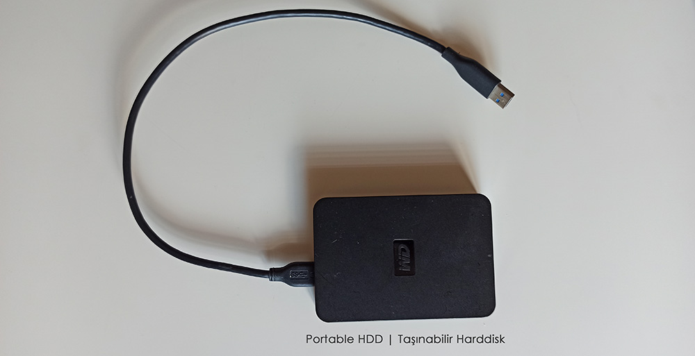 Üstte ise USB Harddisk ya da Portable HDD olarak bilinen taşınabilir Harddisk oluyor. Bunları daha çok depolama amaçlı kullanıyoruz. USB bağlantısı bulunan laptop veya masaüstü gibi bütün bilgisayarlarda kullanabilirsiniz. Tak çalıştır şeklinde bağlantı sağlıyorlar.