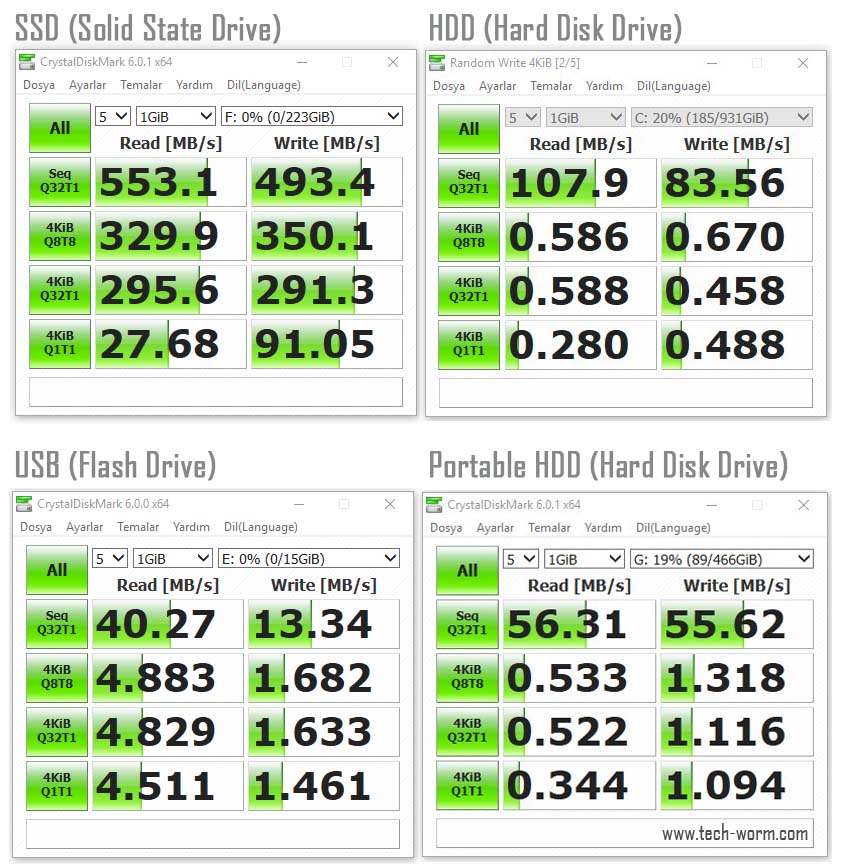 Bir diğer bilinmesi gereken en önemli değer Okuma/Yazma oranlarıdır. Bu değer aslında harddiskinizin ne kadar hızlı olduğunu gösteren önemli bir göstergedir. Bir HDD’in maksimum yazma hızı ortalama 150mb/sn iken SSD’lerde bu hız 560mb/sn‘dir. Aşağıda kendi bilgisayarımda test ettiğim sonuçları görmektesiniz. SSD; Toshiba OCZ TR200 240GB SSD, HDD; WD Blue 1TB 7200RPM, USB; SanDisk Cruzer Blade 16GB, Portable HDD; Taşınabilir WD Elements 500GB HDD.