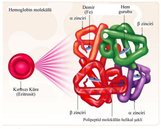 Hemoglobin ise, kan hücreleri olan eritrositlerin (alyuvar) yapısında bulunan, hem ve globulin’den oluşan kana kırmızı rengi veren bir pigmenttir. Hemoglobin’in en önemli görevi solunum organından dokulara oksijen, dokulardan solunum organına ise karbondioksit taşımaktır. (Hemoglobin; akciğer kapillerinden aldığı oksijeni dokulara, dokulardan aldığı karbondioksiti akciğerlere taşır.) Başlıca sentez yeri eritrosit üretimi sırasında kemik iliğidir. Yaş, cinsiyet ve türe göre küçük farklılıklarla da olsa kanda belli bir değerin altında bulunmasına Anemi, yüksek miktarda bulunmasına ise Polisitemi denir.