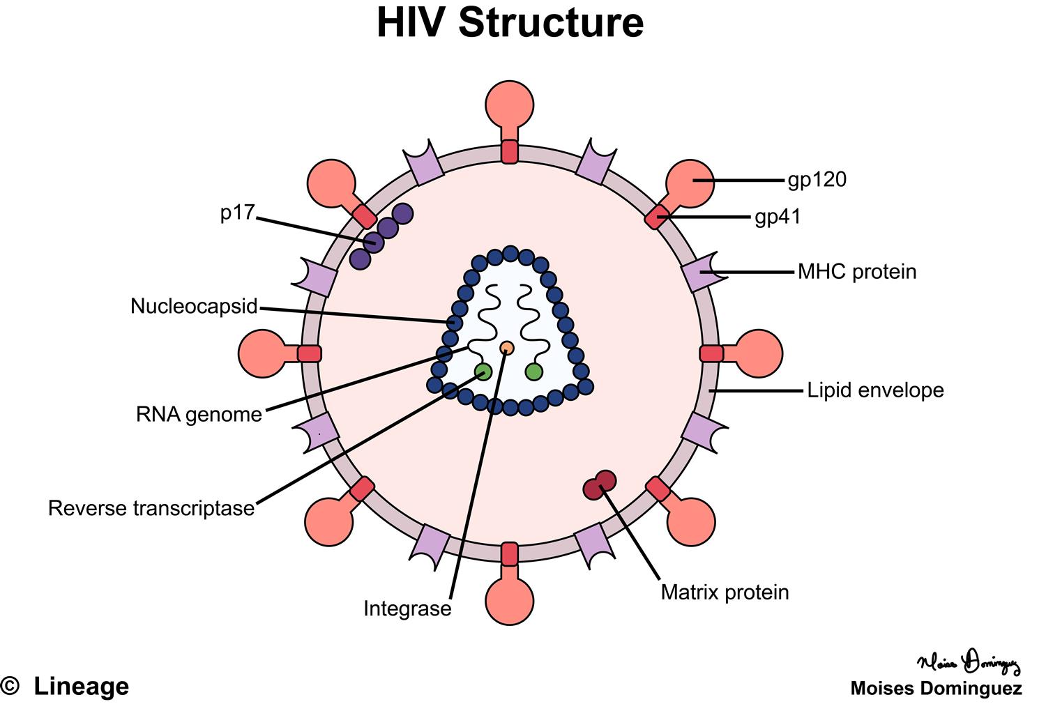 HIV Virüsü tek sarmallı RNA’yı çevreleyen p24 proteinlerinden oluşan kapsit, bunun dışında küçük bir matriksi çevreleyen kılıftan oluşur. Kılıfta virüsün antijenik yapısını belirleyen glikoproteinler bulunur. HIV virüsünün üç glikoproteini vardır. gp160: Proteaz enzimi ile alt üniteleri olan gp120 ve gp41’e bölünerek iki ayrı glikoprotein oluşur. Bu proteinler virüsün membranında bulunurlar. gp41: HIV’in hücreye girmesini sağlar. gp120: HIV’in DNA’ya tutunmasını sağlar. LEDGF: HIV’in DNA’ya nasıl gireceğini belirler.
