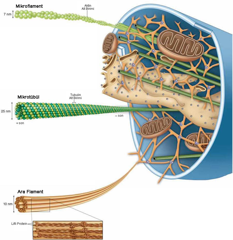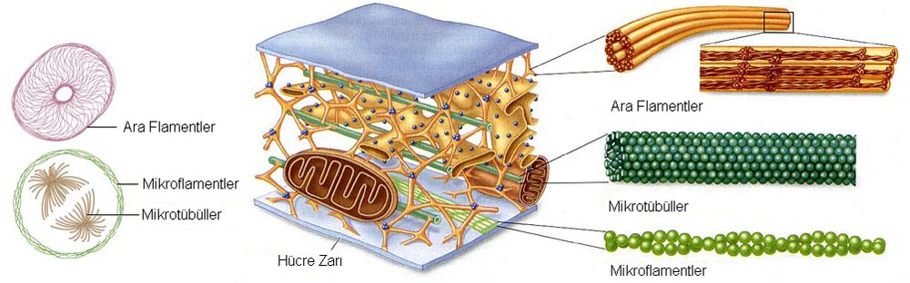 Ara (İntermediyer) Flamentler: Mikroflamentlerden daha kalın, mikrotübüllerden daha ince olan bir hücre iskeleti elemanıdır. Farklı tipteki protein iplik yapılarının birbiri üzerine sarılmasıyla oluşur. Diğer ikisinden (mikrotübül ve mikroflament) daha kararlıdır. Hücre şeklinin ve hücre içi yapıların sabitlenmesinde görev alır. Örneğin; çekirdeğin hücre içindeki yerinin sabitlenmesini ara filamentler sağlar. Keratin yapılı ara flamentler deri hücreleri arasında bağ kurarak dokunun dış etkenlere karşı dayanıklılığını arttırır. Keratin, saç, tırnak gibi yapılarda bulunur.