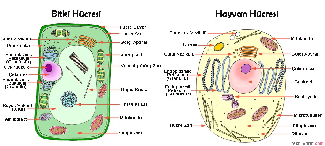 Organeller: Endoplazmik Retikulum, Mitokondri, Lizozom, Ribozom, Golgi Aygıtı, Plastitler (Kloroplast, Kromoplast, Lökoplast), Koful, Sentrozom, Peroksizom.