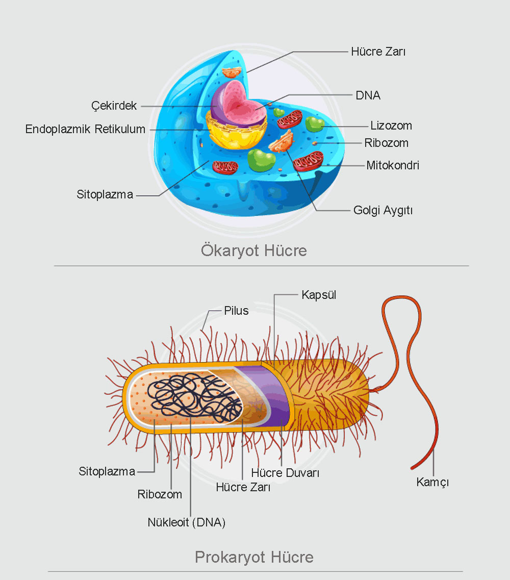 Ökaryotik hücreler, prokaryotlara göre çok gelişmiş olup; bitkiler, hayvanlar, mantarlar ve protistler âlemlerini kapsar. Prokaryotlar ise; monera (bakteriler, arkeler) alemini kapsar.