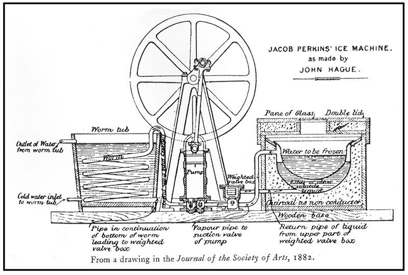 Jacob Perkins (1766-1849) pistonla çalışan ilk buzdolabını üretmiştir.