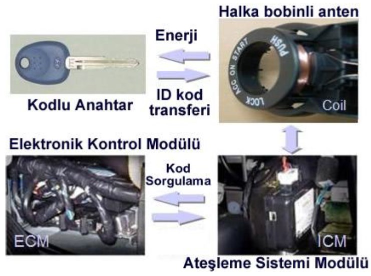 Araçta kontak anahtarı çıkartıldığında, otomatik olarak devreye giren bu sistem ile hırsızlığa karşı ekstra koruma sağlanmaktadır. İmmobilizer sistemin diğer ismi şifre (code) sistemidir. Bu şifre sistemi ile elektronik olarak motor bloke edilmektedir. Kontak anahtarı silindirine sürücü anahtarı yerleştirildiğinde, sürücü anahtarı üzerinde bulunan elektronik kod üreteci, sistemin elektronik kontrol modülüne, kontak anahtarı üzerinde bulunan halka şeklindeki anten vasıtasıyla bir kod gönderir. Bu kod, doğru olarak algılandığında ECU, ateşleme ve yakıt sistemlerini çalıştırır. Aksi durumda, yanlış anahtar veya anahtarsız bir çalıştırma denendiğinde, ECU bunu doğru kod olarak algılamayacak ve ateşleme-yakıt sistemlerini çalıştırmayacaktır. Aşağıdaki şekilde İmmobilizer sisteminin çalışması görülmektedir.