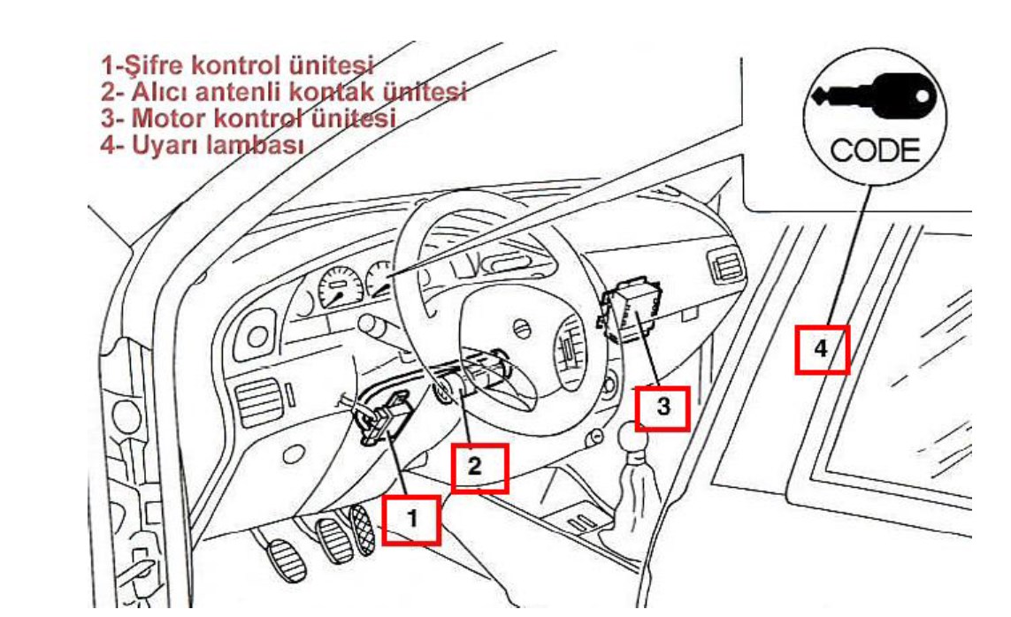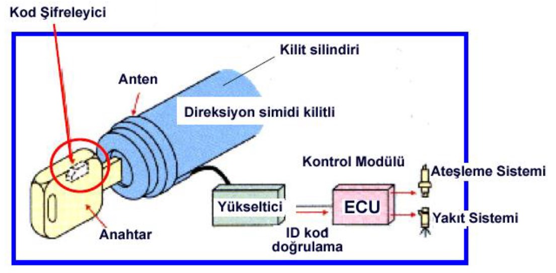 Sistemin temel parçaları; motor kontrol ünitesi, şifre kontrol ünitesi, şifre kartı, alıcı antenli kontak ünitesi ve uyarı lambasıdır. Aşağıdaki şekilde sistemin elemanları ve yerleri görülmektedir.