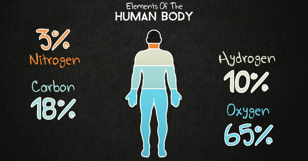 İnsan varlığını maddeye indirgediğimizde kuşkusuz evrende bilinen elementlerin içeriğine sahip olduğunu görüyoruz. Bir insan vücudunun %65’i oksijen, %18’i karbon, %9.5’i hidrojen, %3.2’si nitrojen (azot), %1.5’i kalsiyum, %1.2’si fosfor, 0.4 potasyum, %0.2 sülfür, %0.2 sodyum, %0.2 klor, %0.1 magnezyum ve %1 gibi eser miktarda farklı elementler içerdiğini biliyoruz. Yani insan vücudunun %99’u sadece 6 elementten (oksijen, karbon, hidrojen, azot, kalsiyum ve fosfor) meydana gelmiştir. Farklı açıdan baktığımızda ise %65’i su, %16’sı protein, %16’sı yağ, %6’sı mineral ve %1’i karbonhidrattan meydana gelmiş olduğunu görüyoruz.
