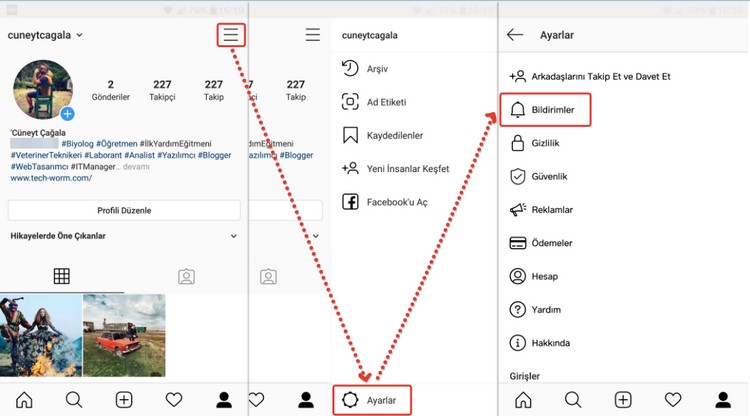 İnstagramda görüntülü arama seçeneğini açmak, tamamen kapatmak veya takip etmediğiniz takipçilere kapatmak için aşağıdaki adımları takip edelim. İnstagram uygulamanızdan sağ üst kısımda bulunan yatay üç çizgi simgesine klikleyin ve açılan yan panelde “Ayarlar” seçeneğini seçin, buradan “Bildirimler” sekmesini klikleyelim.