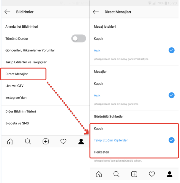 Devamında “Direct Mesajları” yazan sekmeyi klikleyelim. Gelen pencerenin hemen alt kısmında “Görüntülü Sohbetler” başlığı altında üç seçenek görünecektir. Kapalı, Takip Ettiğin Kişilerden veya Herkesten görüntülü arama istekleri için birini seçebilirsiniz. Kapalı seçeneğini seçtiğinizde yanında mavi tik simgesi gelecek ve hiç kimseden görüntülü arama isteği alamayacaksınız. Takip ettiğin kişilerden seçeneğini seçtiğinizde yanında sadece takip ettiğiniz kişilerden görüntülü arama isteği alacaksınız. Aynı şekilde Herkesten seçeneğini seçtiğinizde yanında mavi tik simgesi gelecek ve herkesten görüntülü arama isteği alabileceksiniz.